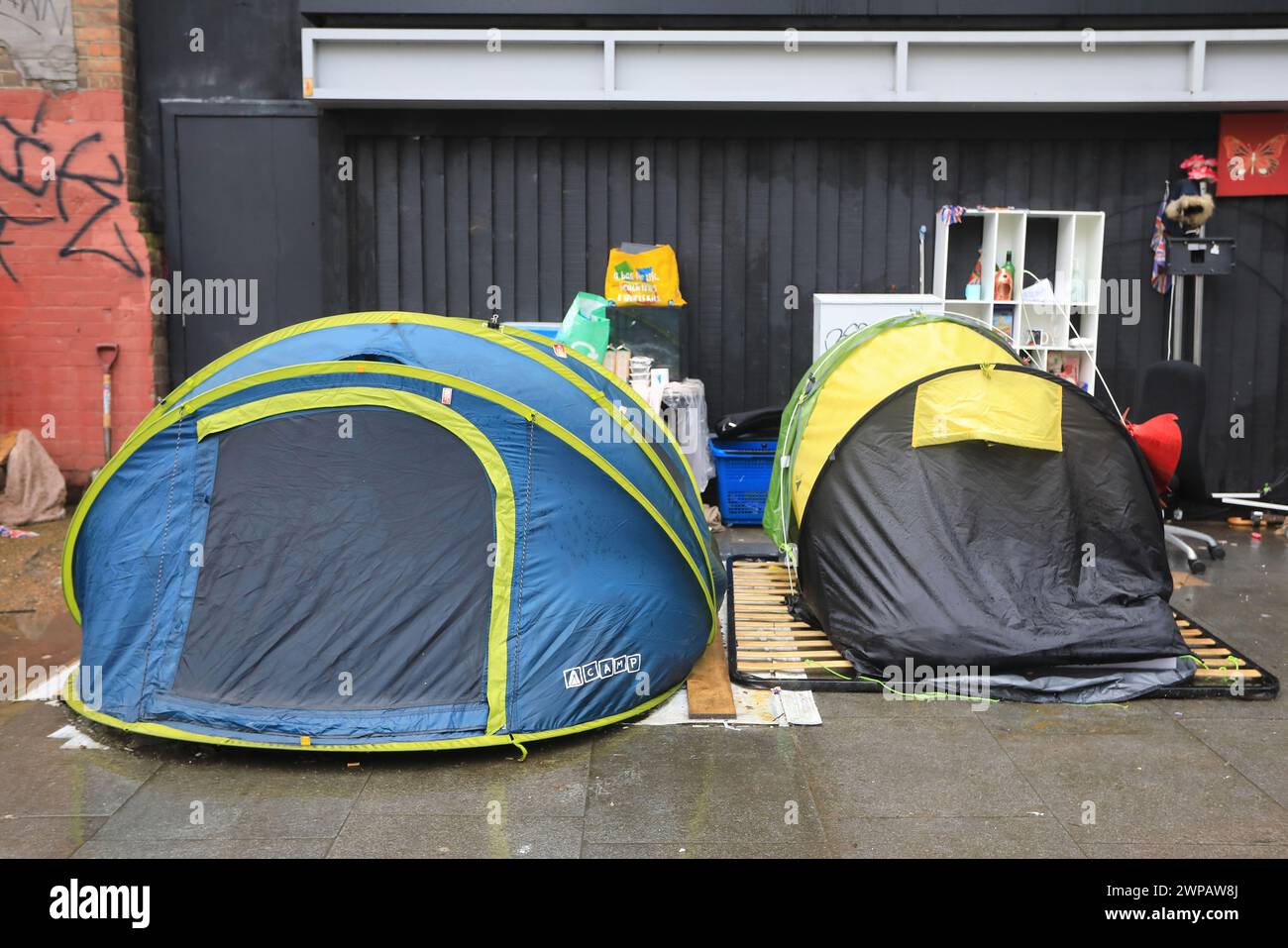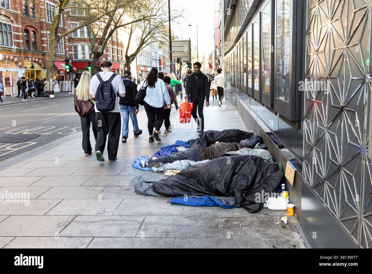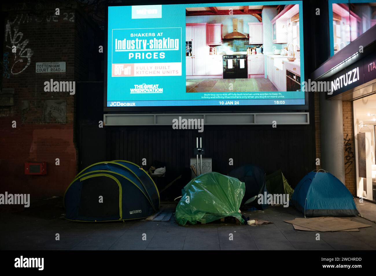 Homeless and rough sleepers tents on Tottenham Court Road underneath a