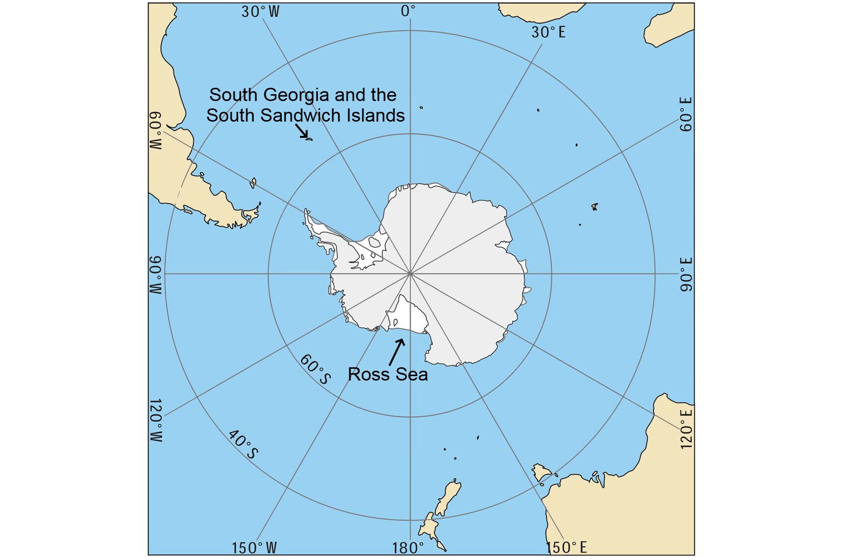 Map of Antarctica showing continental land and the 5 ocean sectors