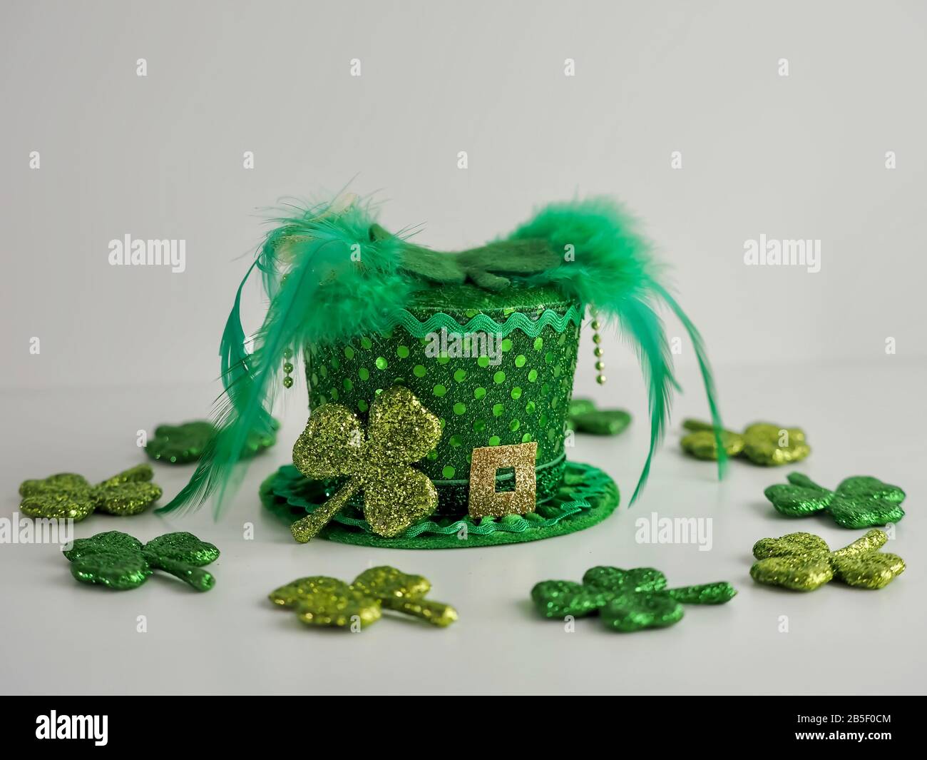 Green polka dot leprechaun hat with green boa and a gold buckle