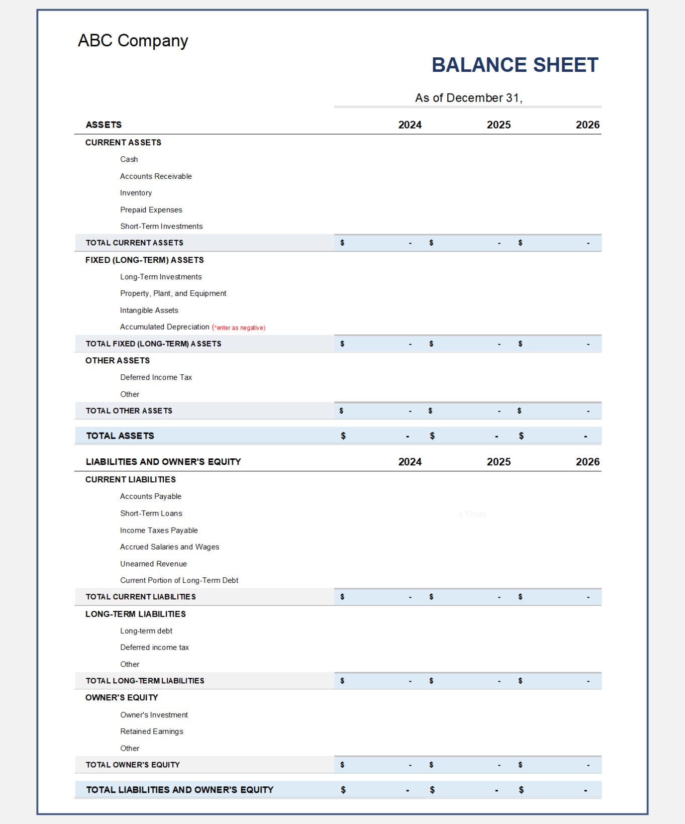 3 Year Balance Sheet Template Printable PDF Word Excel