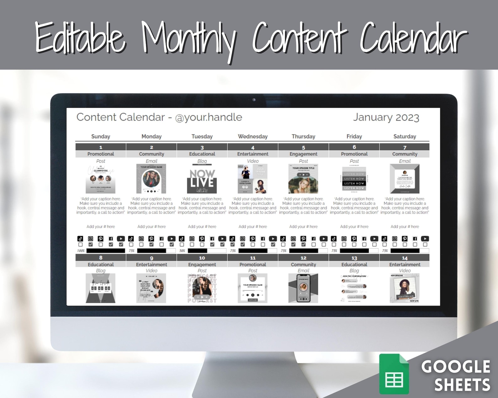 30 day content calendar editable social media planner google sheets