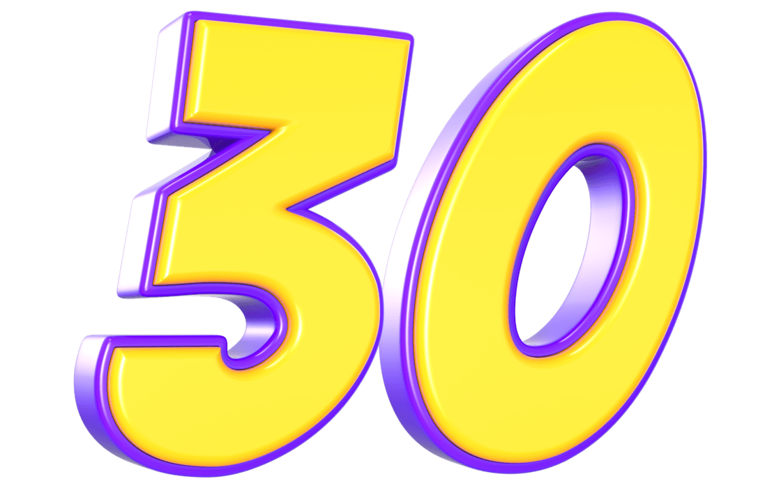 the number 30 in gold is displayed on a gray background with an