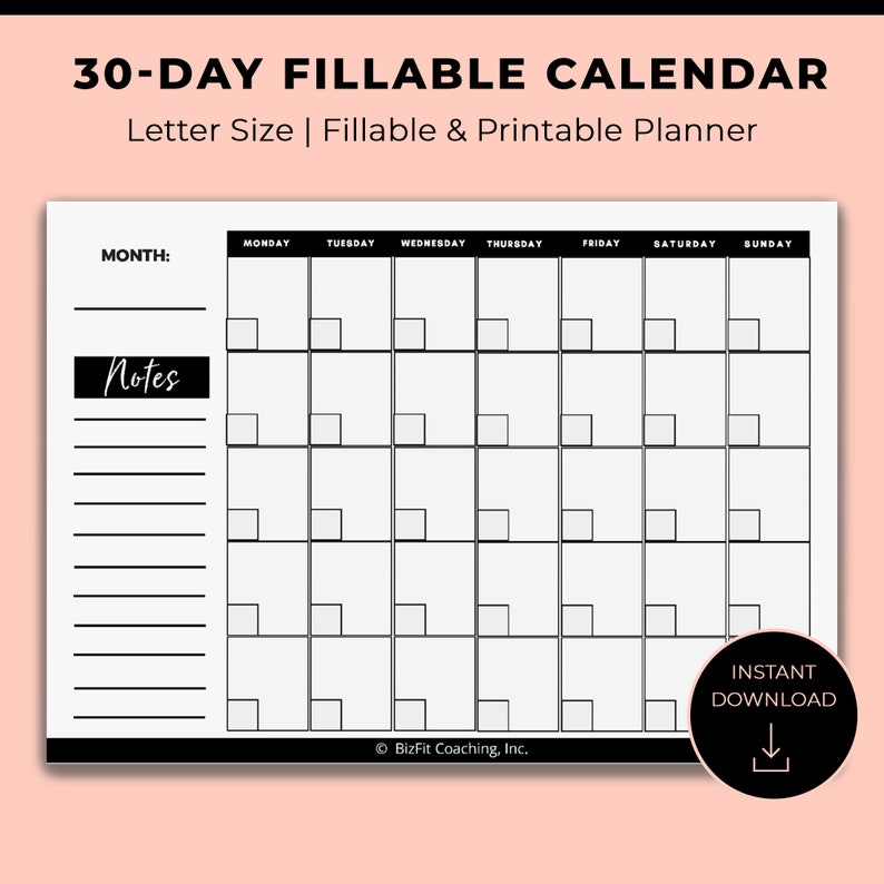 Fillable 30 to 31 Days Calendar Monthly Planner Editable and