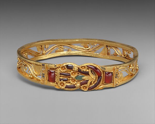 Gold ring with intaglio of seated woman and flying Eros Greek