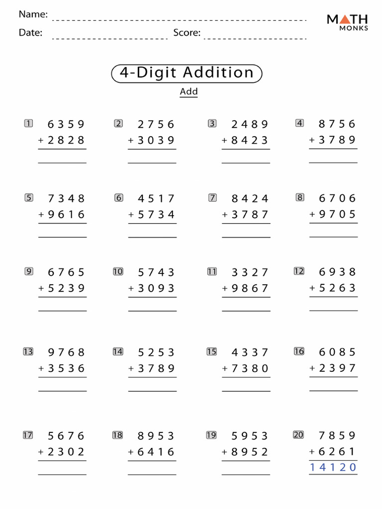 Addition: 3 Digits and 4 Digits Worksheet for 2nd 3rd Grade Lesson