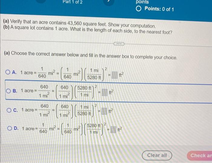 Solved: 4 An acre is equal to 43 560 square feet and there are 5280