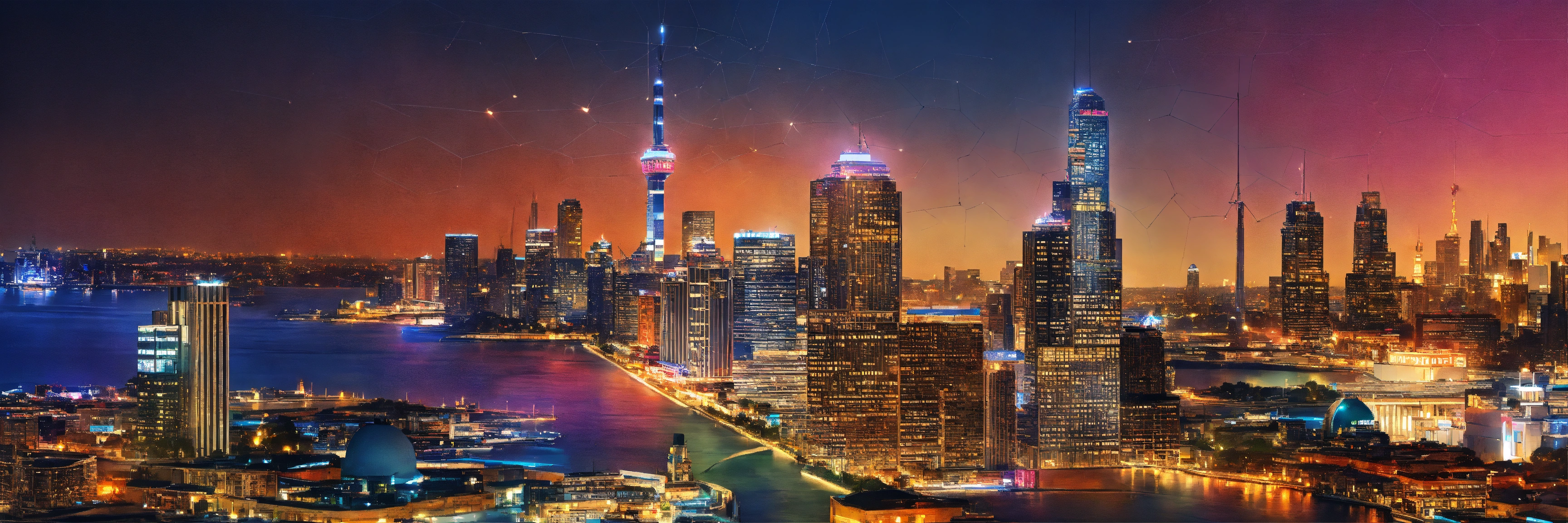 Panoramic View of a Vibrant City Skyline at Twilight with Illuminated