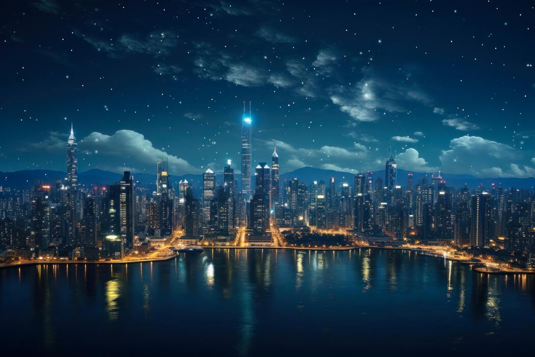 Premium AI Image Photo of a Blue Tinted City Skyline at Night With