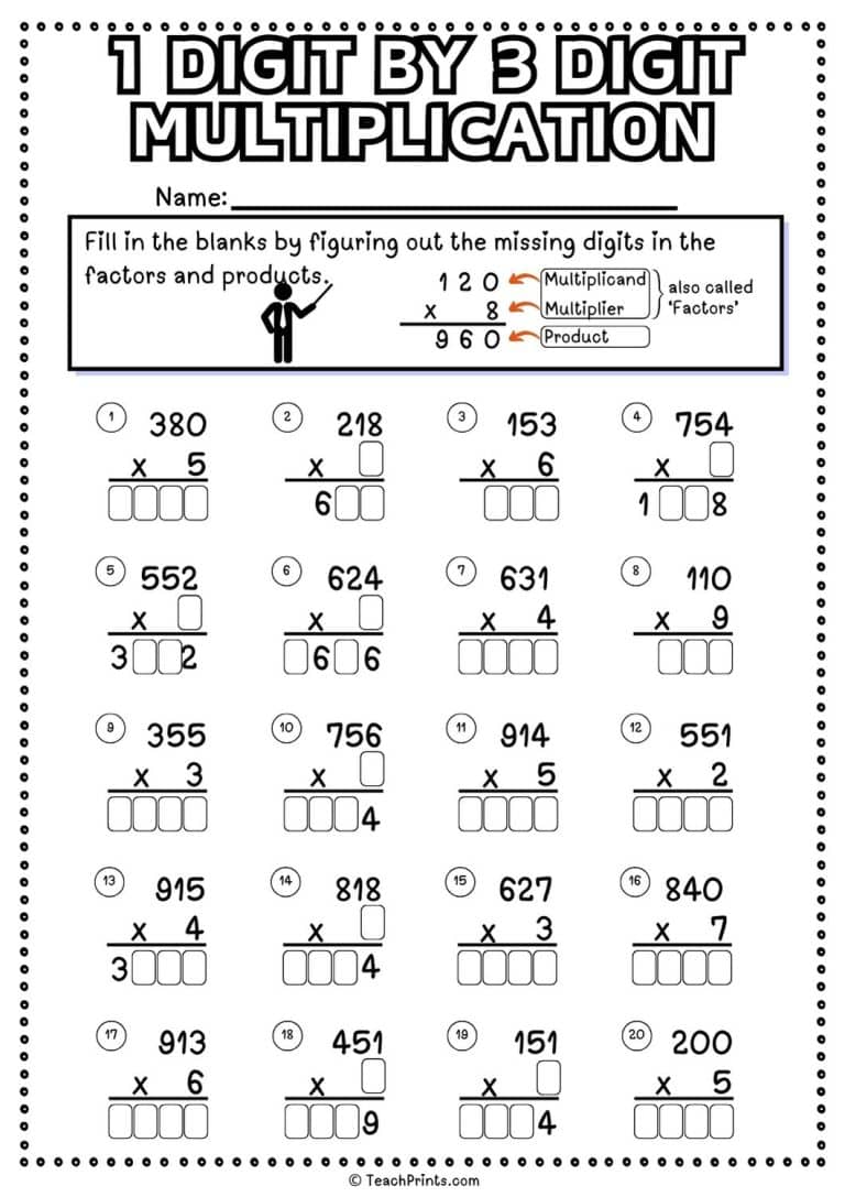 1 Digit by 3 Digit Multiplication Worksheets Teach Prints