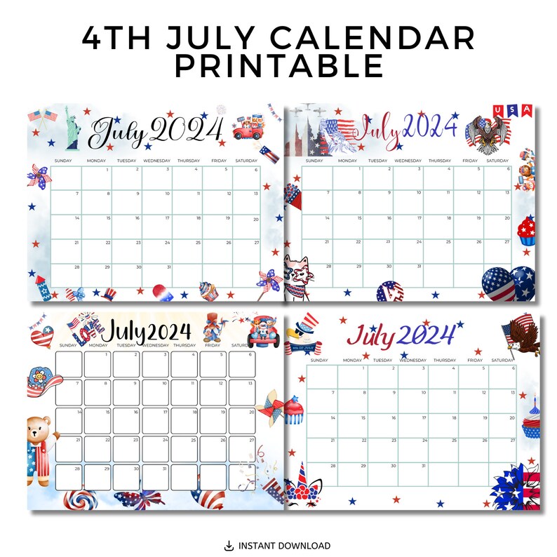 4th July Calendar Bundle Printable Monthly Calendar 4th July