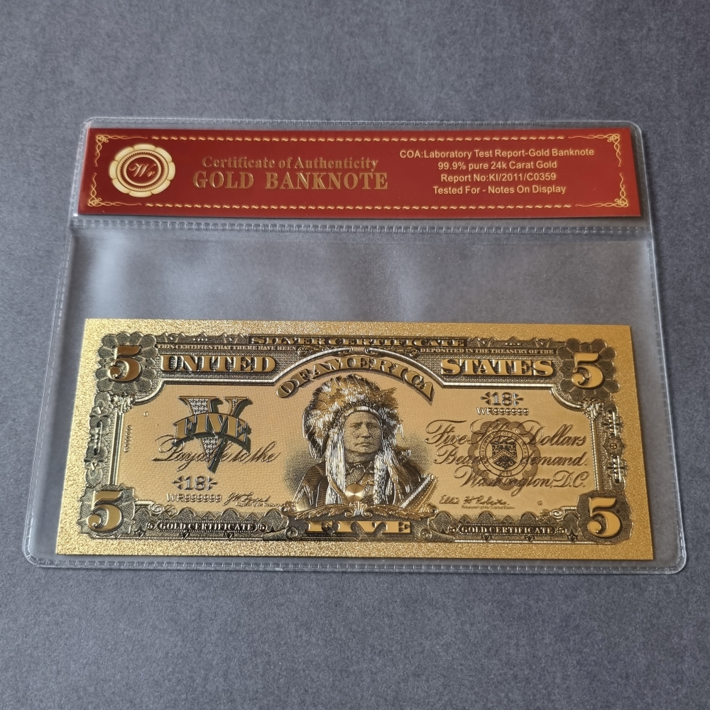 Colourised USA 5 Dollars 1899 Gold Certificate Indian Chief 24k gold