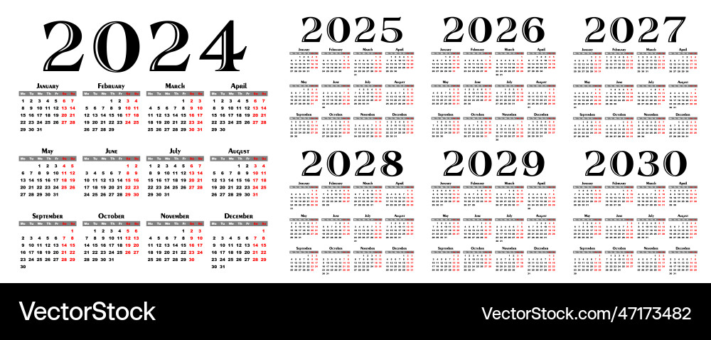 Calendar Templates for a Year 2024 2029 Stock Vector Illustration