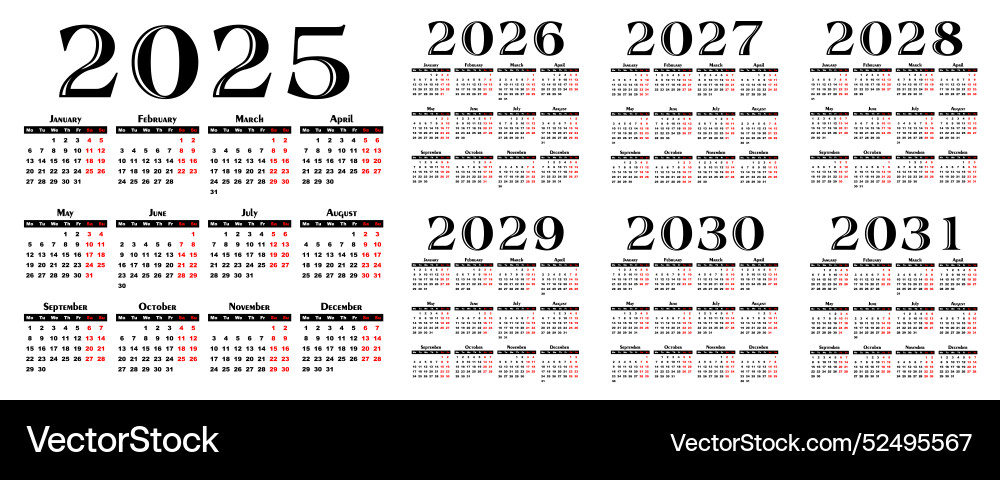 2025 2026 2027 2028 Year Calendar Vector Design Template Stock Vector