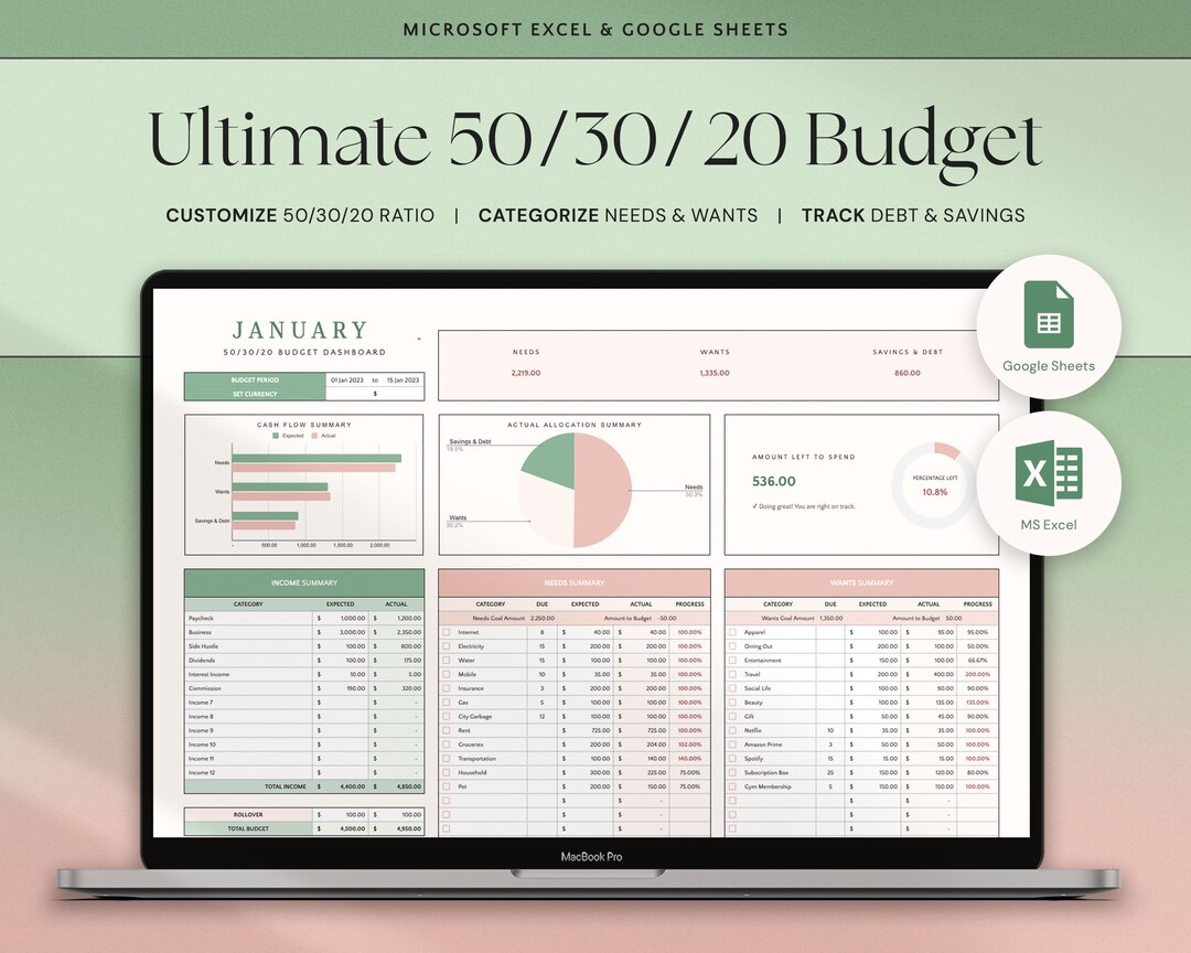 50/30/20 Budget Spreadsheet Excel Google Sheets Monthly Budget Planner