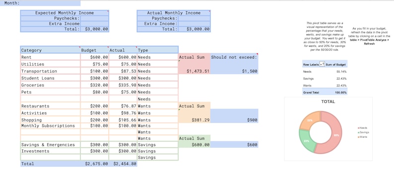 SUPER Easy Budget 50/30/20 Template for Google Sheets Autoformulas to