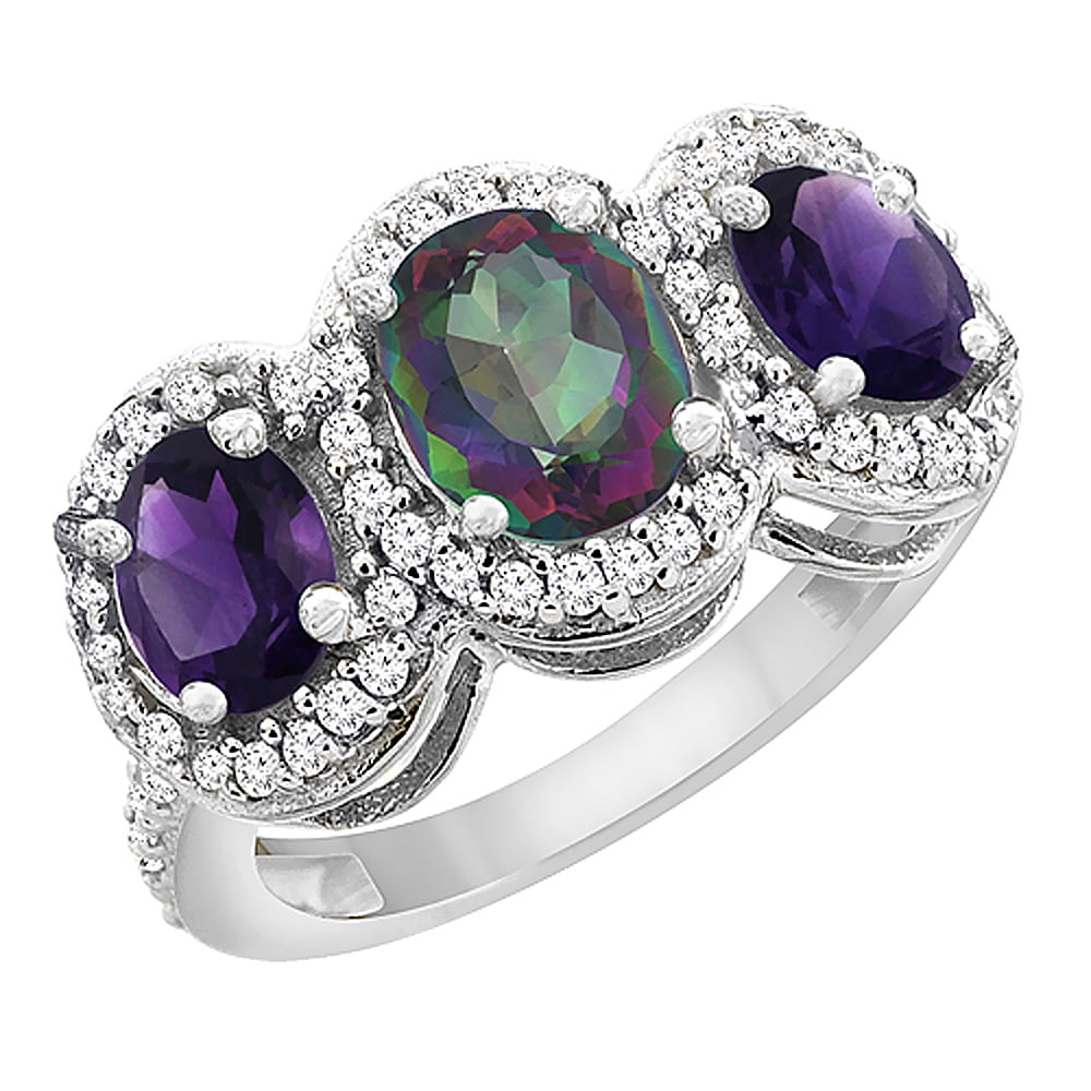 10K White Gold Natural Mystic Topaz Amethyst 3 Stone Ring Oval