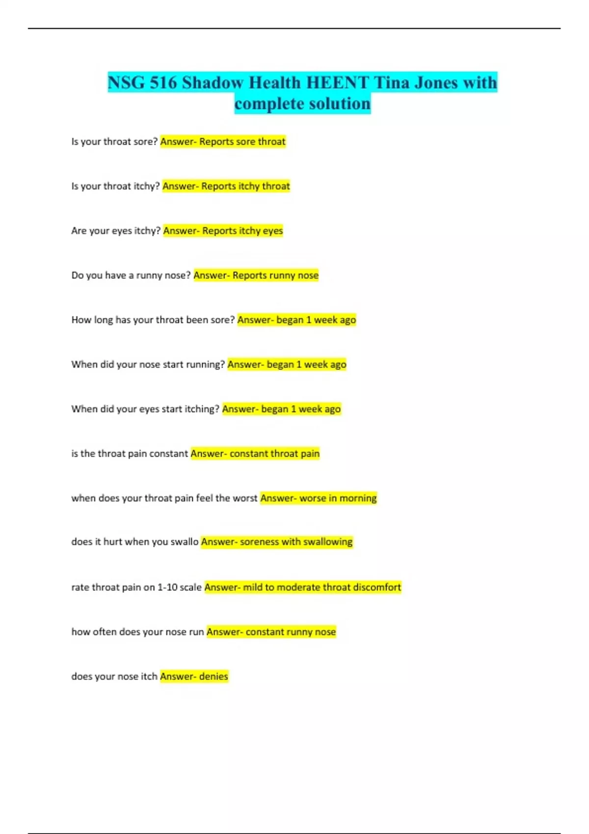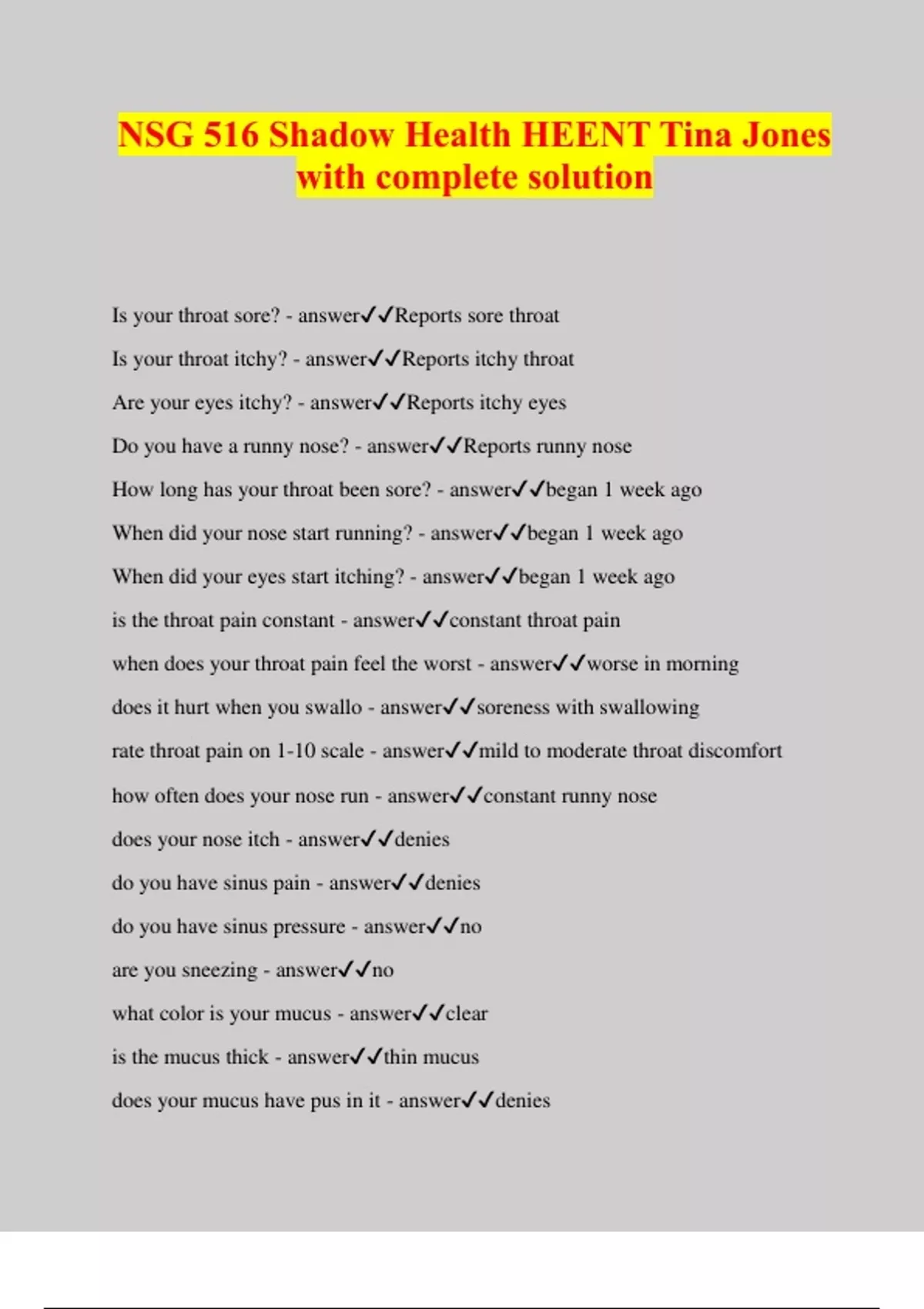 NSG 516 Shadow Health HEENT Tina Jones with complete solution
