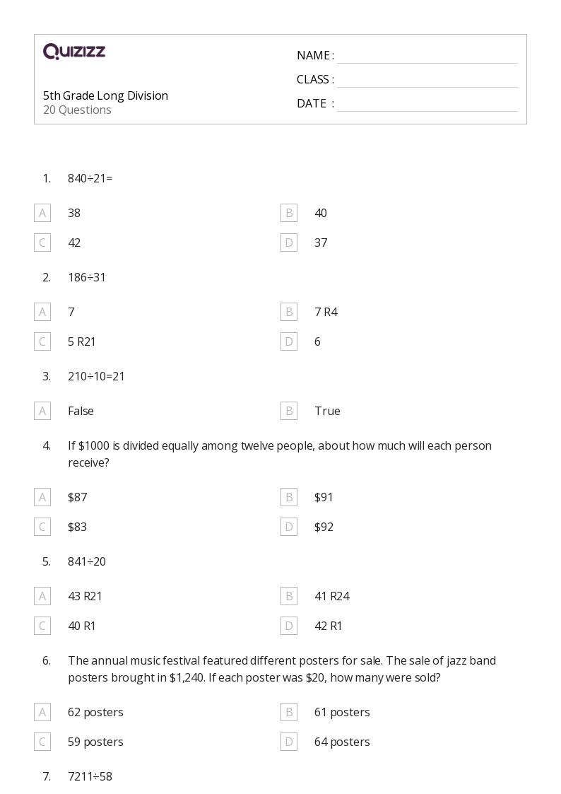 50 Long Division worksheets for 5th Grade on Quizizz Free