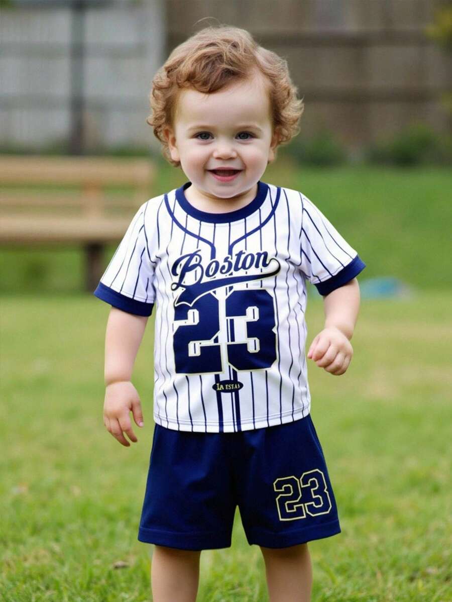 SHEIN 2pcs/Set Baby Boy Striped Number Letter Print Short Sleeve T