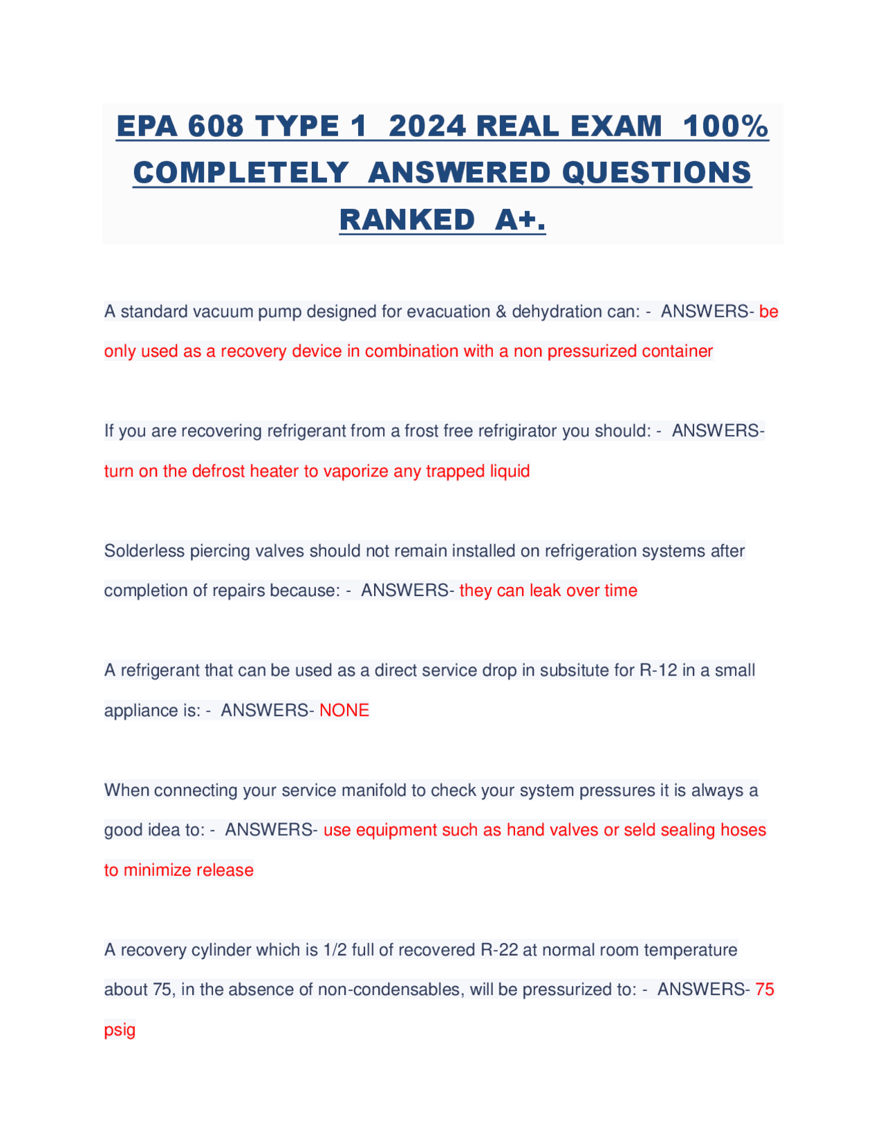 EPA 608 Type 1 Questions and Answers 100% Pass EPA 608 Type 1 Stuvia US