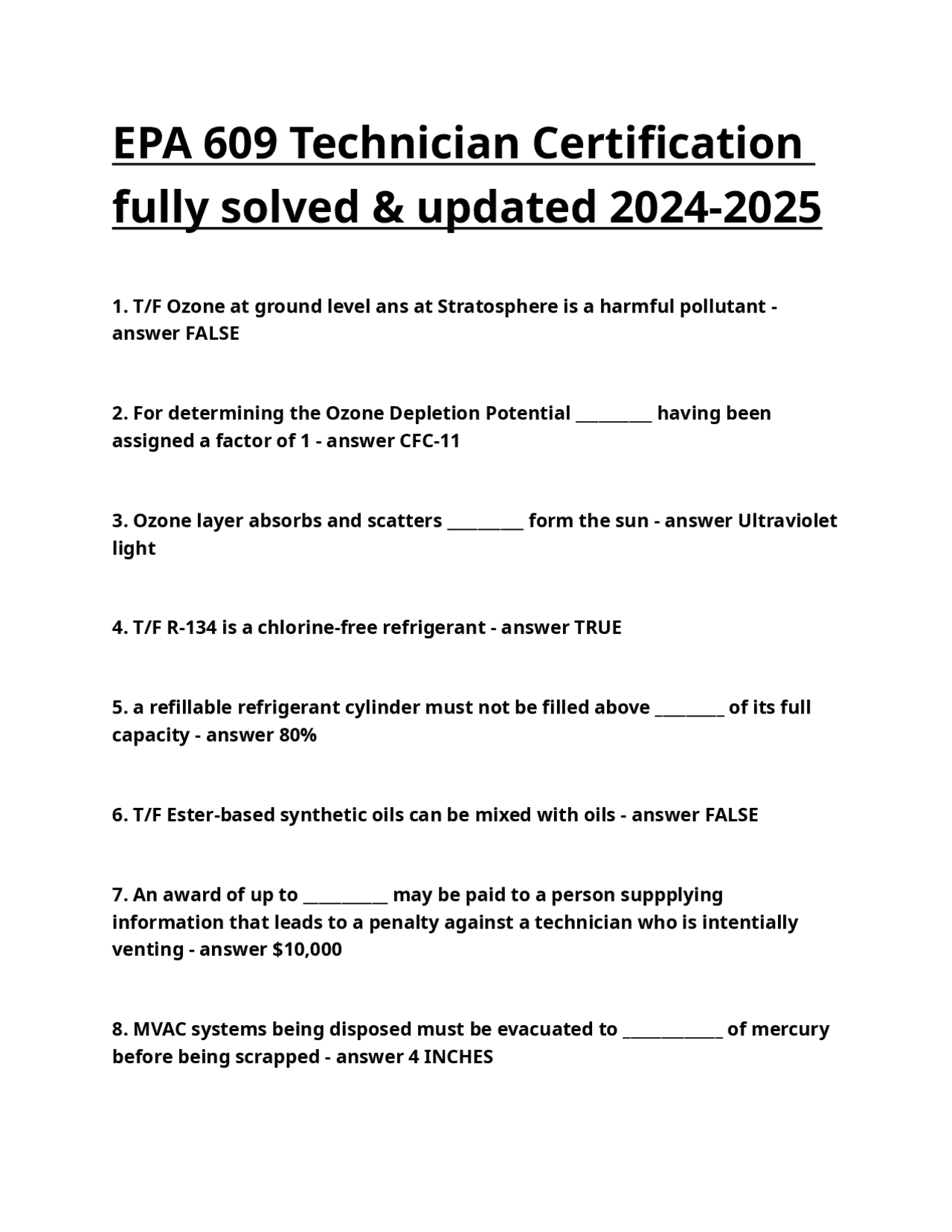 EPA 609 Technician Certification fully solved updated 2024 2025 docx