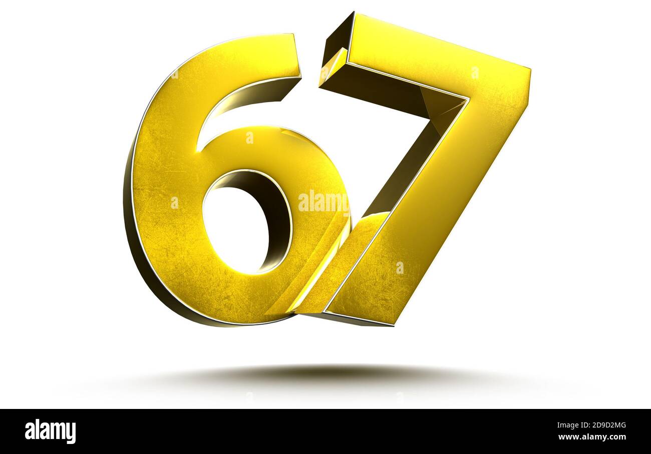 Gold numbers 67 isolated on white background illustration 3D rendering