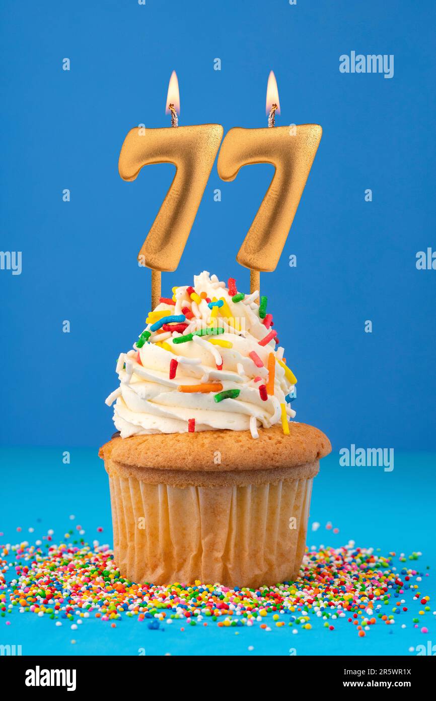 Candle number 77 Cake birthday in blue background Stock Photo Alamy