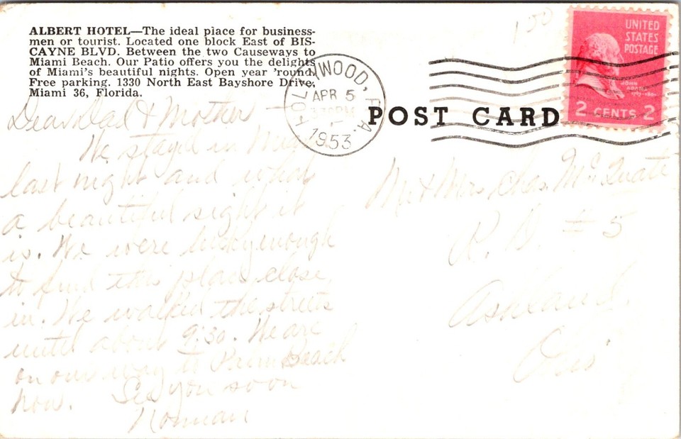 Postcard FL Miami Albert Hotel 1330 Northeast Bayshore Drive