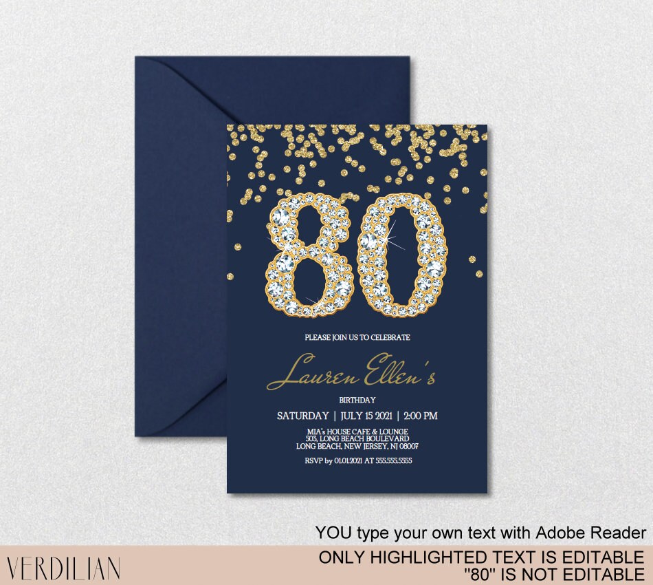 Birthday Invitation 80th Birthday Party Invitation Editable Digital