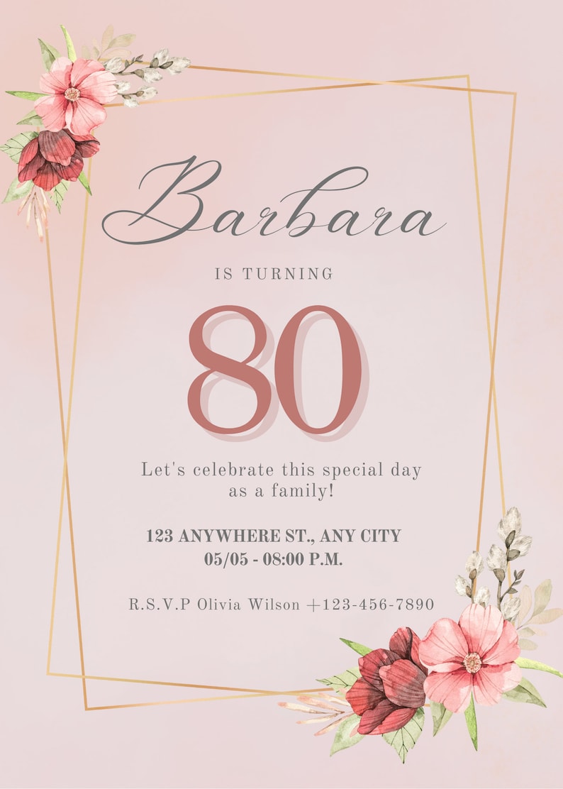 Free Pink 80th Birthday Invitations For Women Template to Edit Online