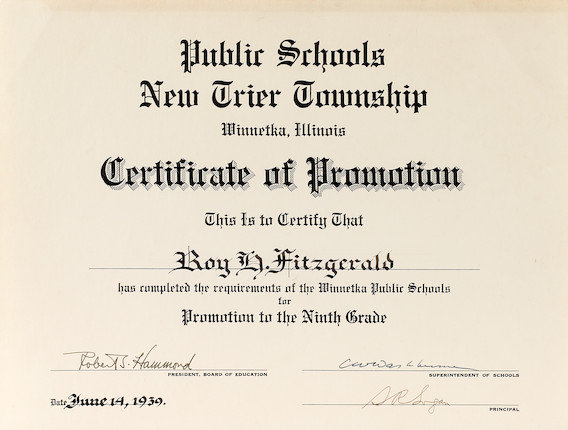 Bonhams : A Rock Hudson 8th grade graduation certificate