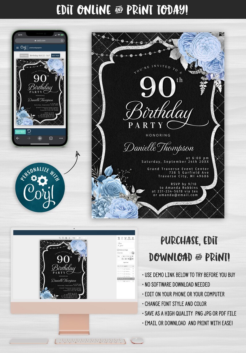 90th Birthday Invitation Printable Template Editable Birthday Etsy