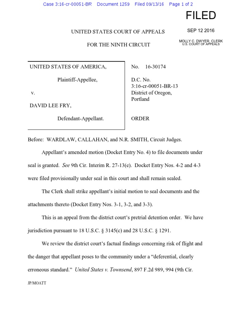 09 13 2016 ECF 1259 USA V DAVID FRY Order of USCA 9th Circuit Re