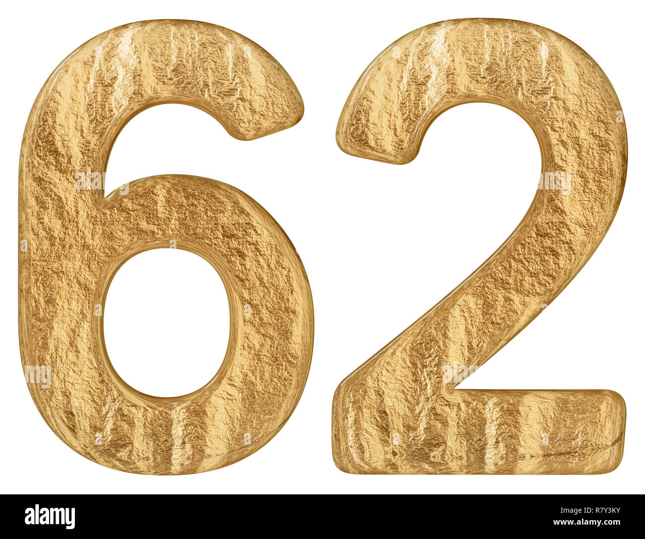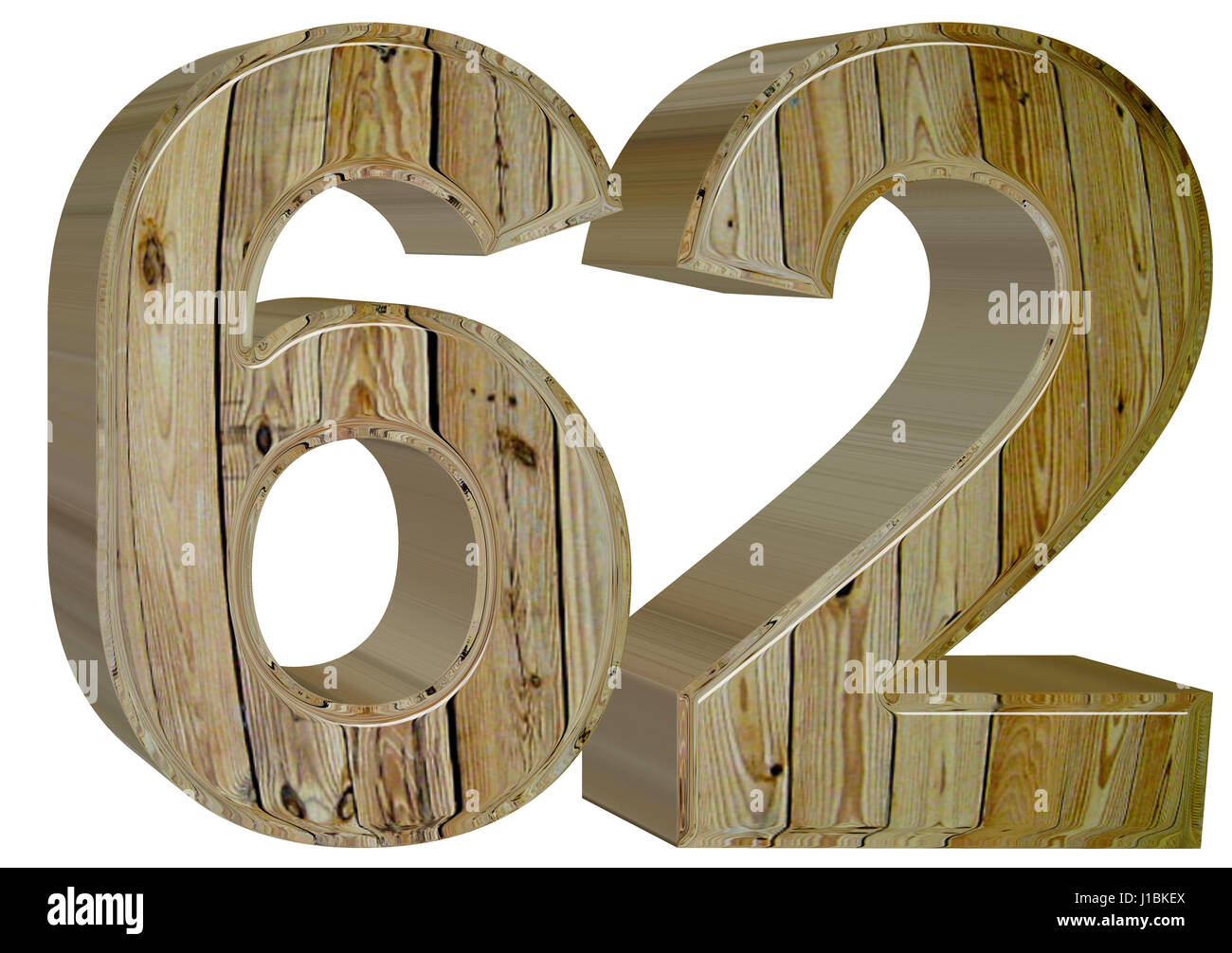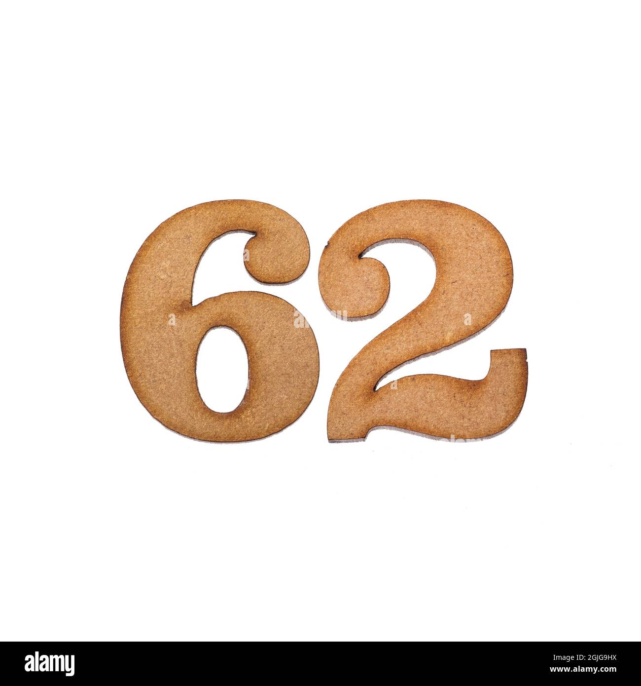 Number sixty two 62 Piece of wood isolated on white background Stock