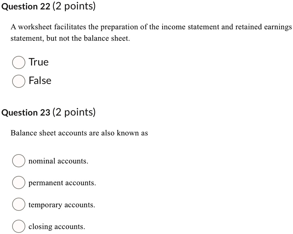 Question 22 (2 points) A worksheet facilitates the preparation of the
