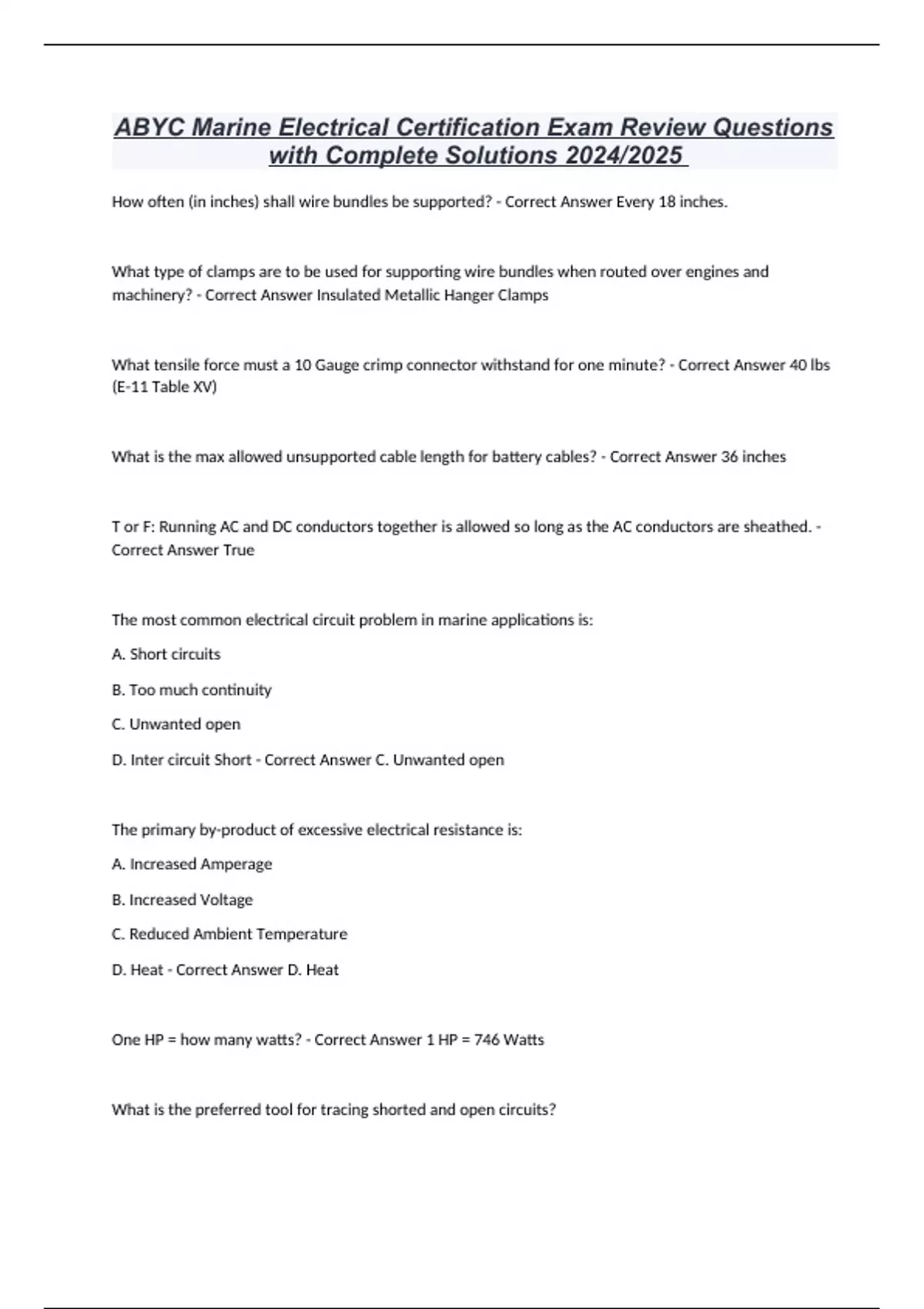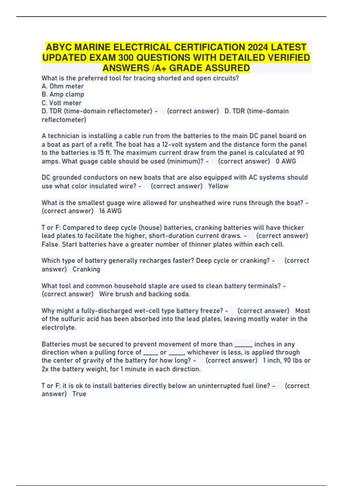ABYC MARINE ELECTRICAL CERTIFICATION EXAM 2024 ALL QUESTIONS AND