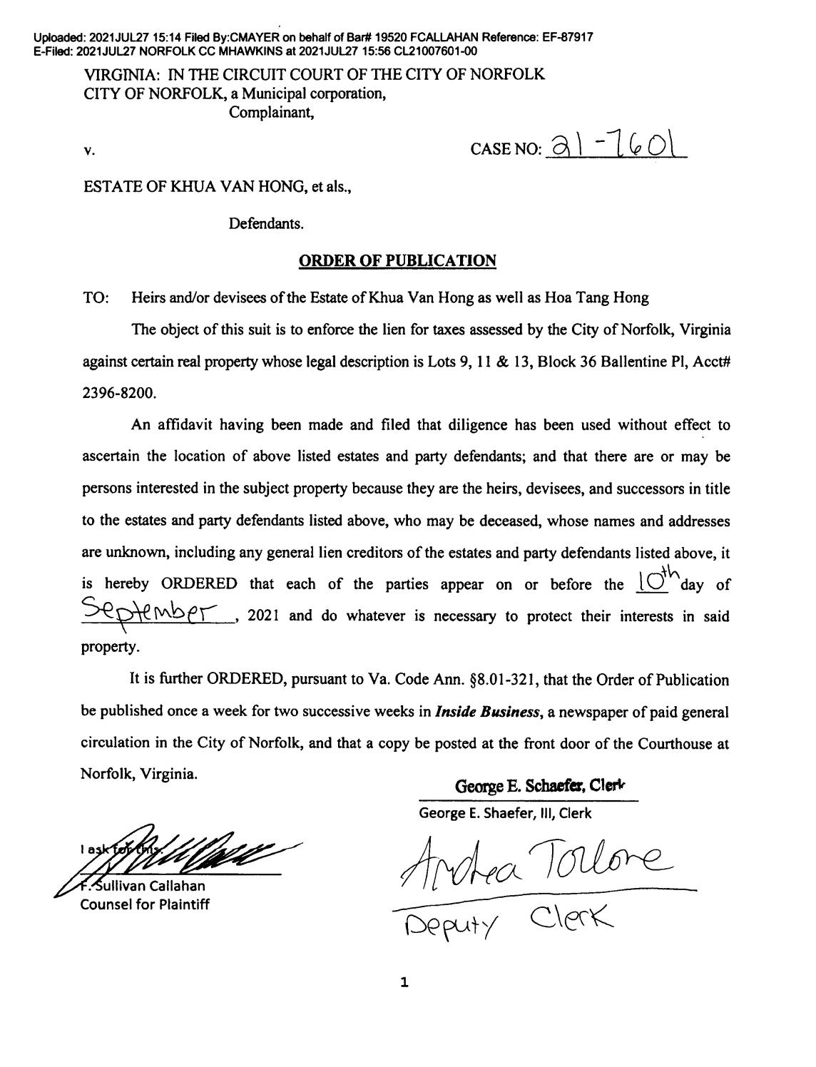 CL22 2337 ORDER OF PUBLICATION by Norfolk Circuit Court Clerk #39 s Office
