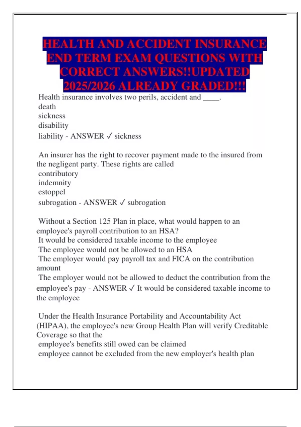HEALTH AND ACCIDENT INSURANCE END TERM EXAM QUESTIONS WITH CORRECT