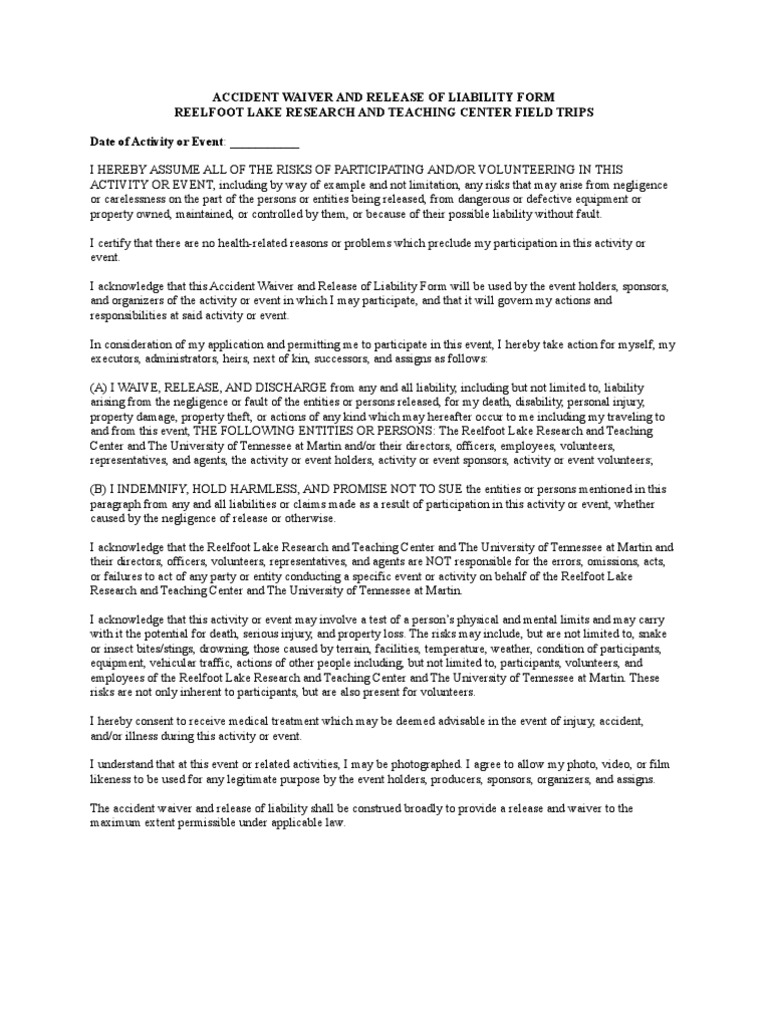 Accident Waiver and Release of Liability Form PDF Legal Liability