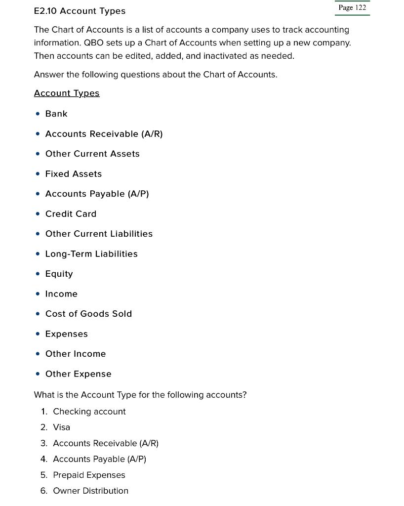 Solved E2 10 Account Types The Chart of Accounts is a list Chegg com