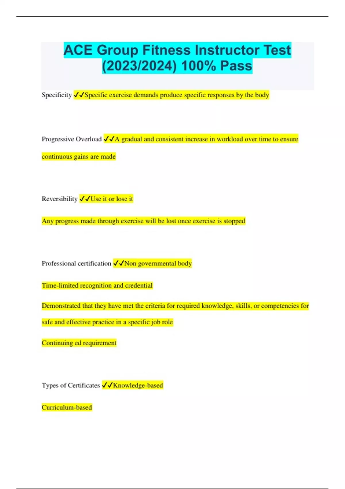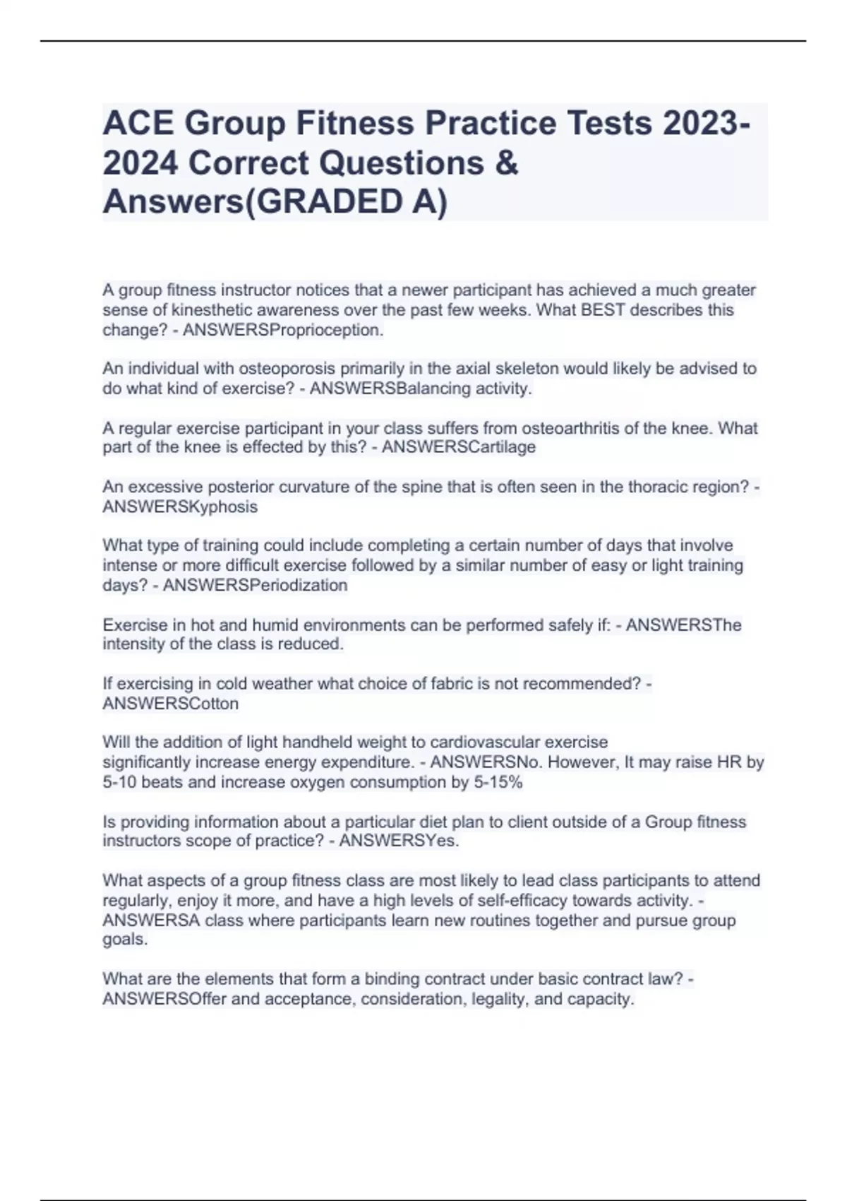 ACE Group Fitness Instructor Test with Correct Answers Fitness