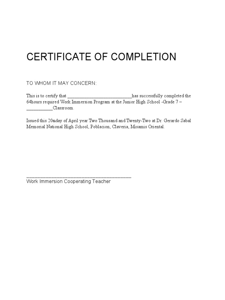 Certificate of Completion Format PDF