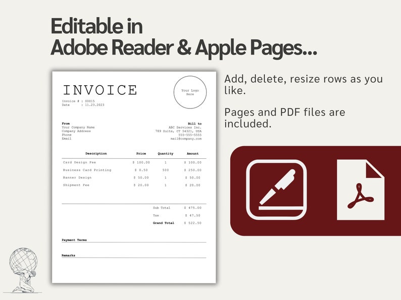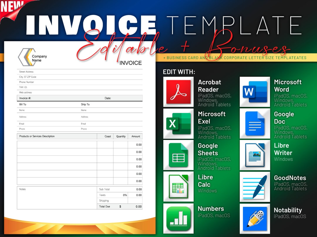 Editable Invoice Template Adobe Acrobat Exel Numbers Google Sheets