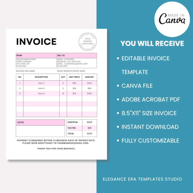 Printable Invoice Custom Form Template Editable Blank Invoice Canva
