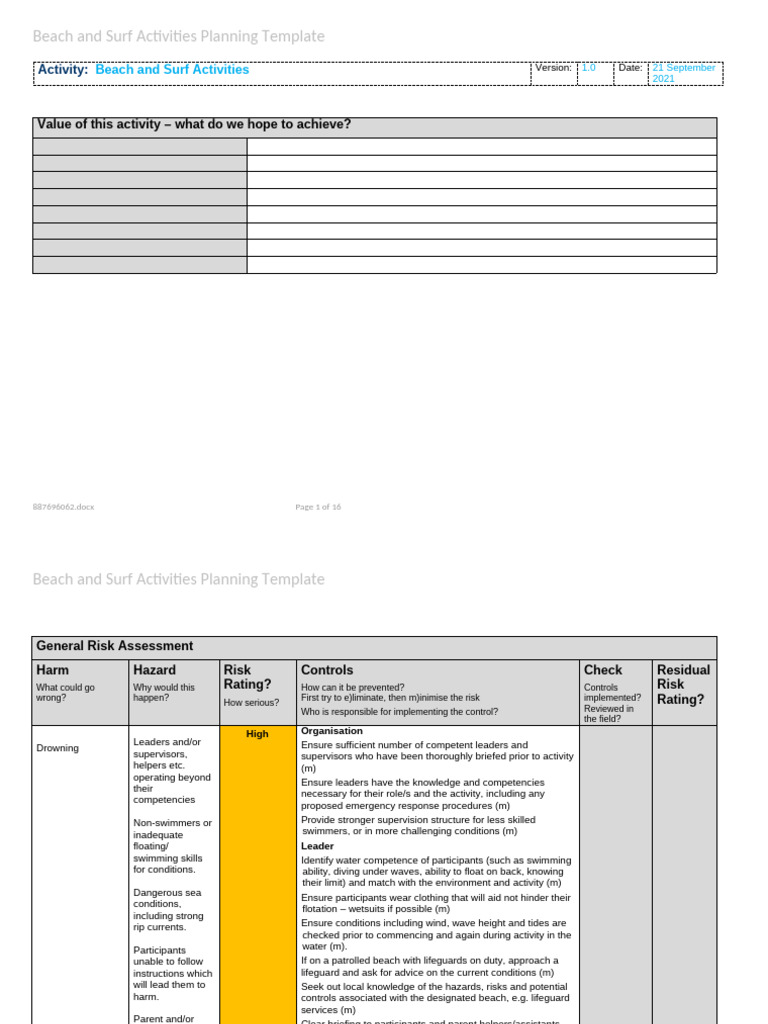 Beach Surf Activities Planning Template v1 2021 PDF Swimming