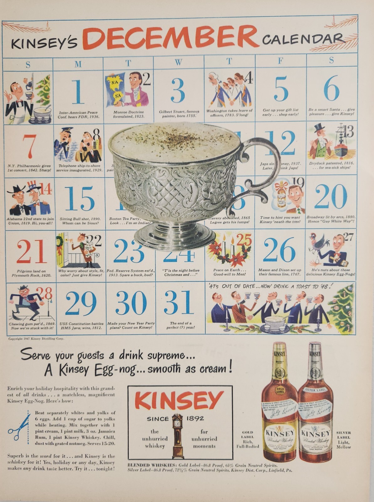 1947 Print Ad Kinsey Blended Whiskey December Calendar Egg Nog eBay