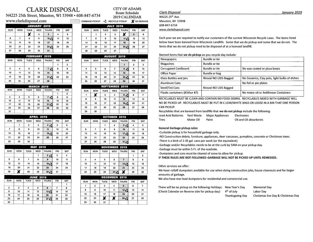 2019 GARBAGE RECYCLING CALENDAR City of Adams Adams County Wisconsin
