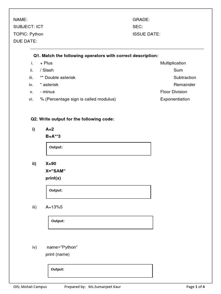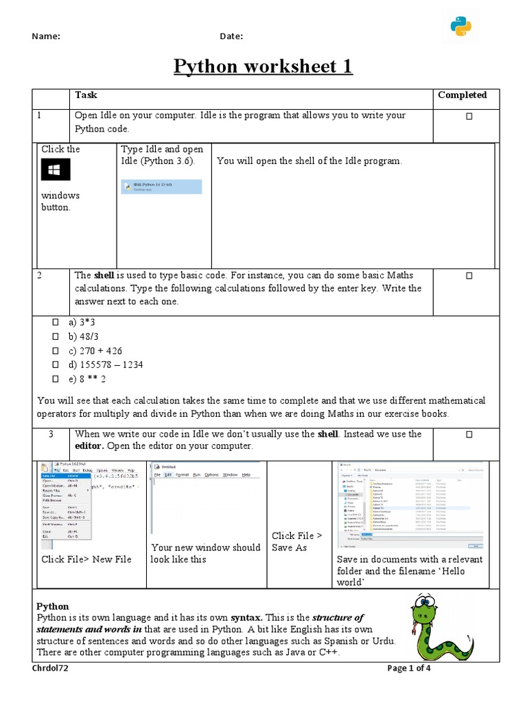 Python Work Sheet 1 PDF Object (Computer Science) Teaching