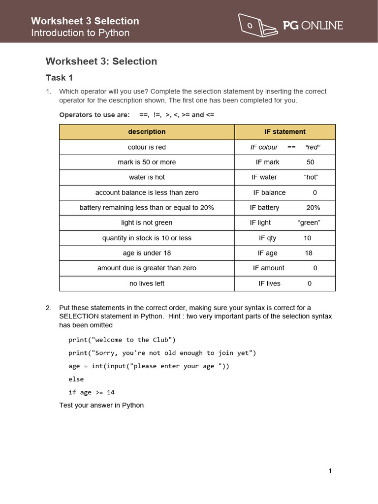 Python Worksheet 3 Selection PDF Computing Computer Programming