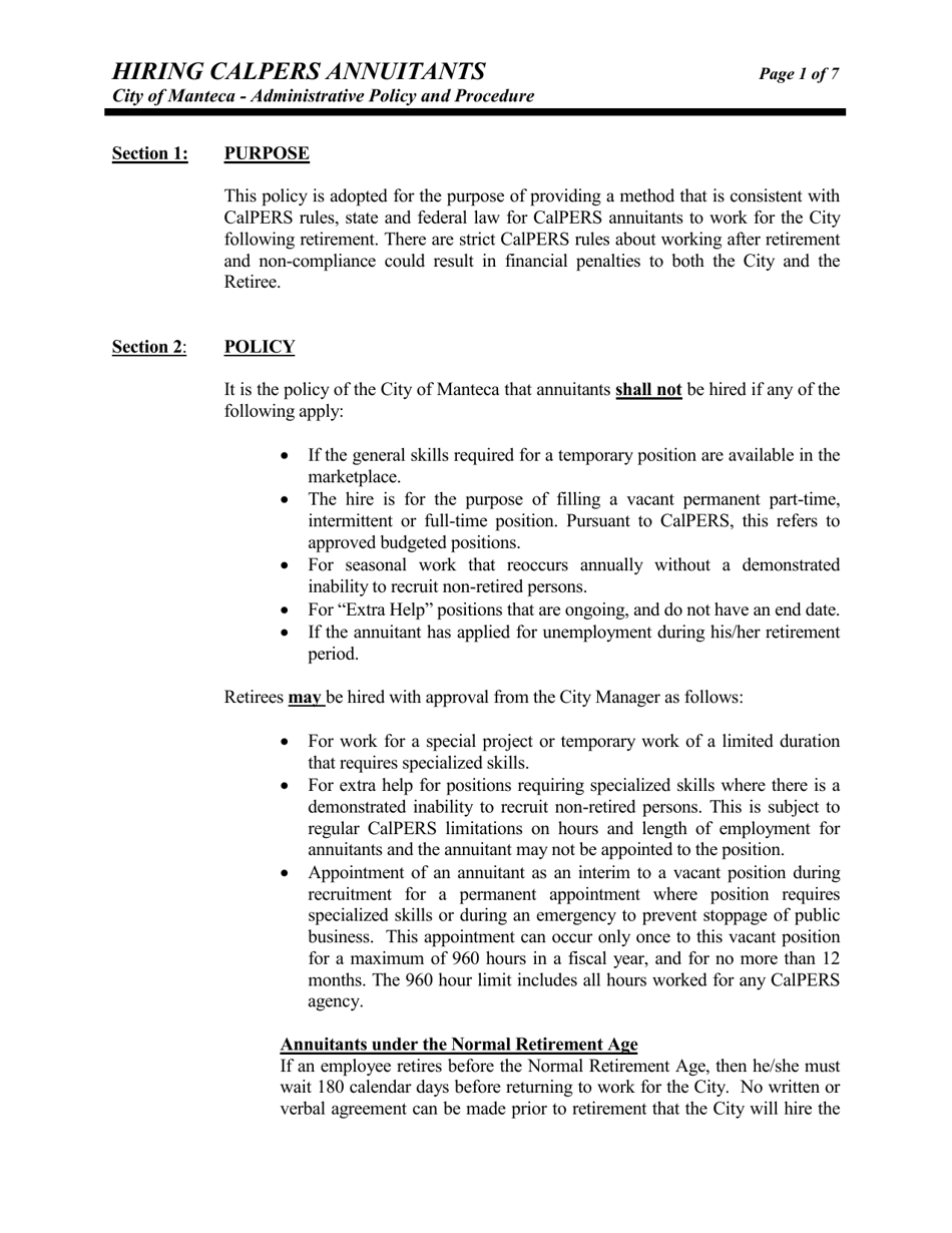 City of Manteca California Hiring CalPERS Annuitants Administrative